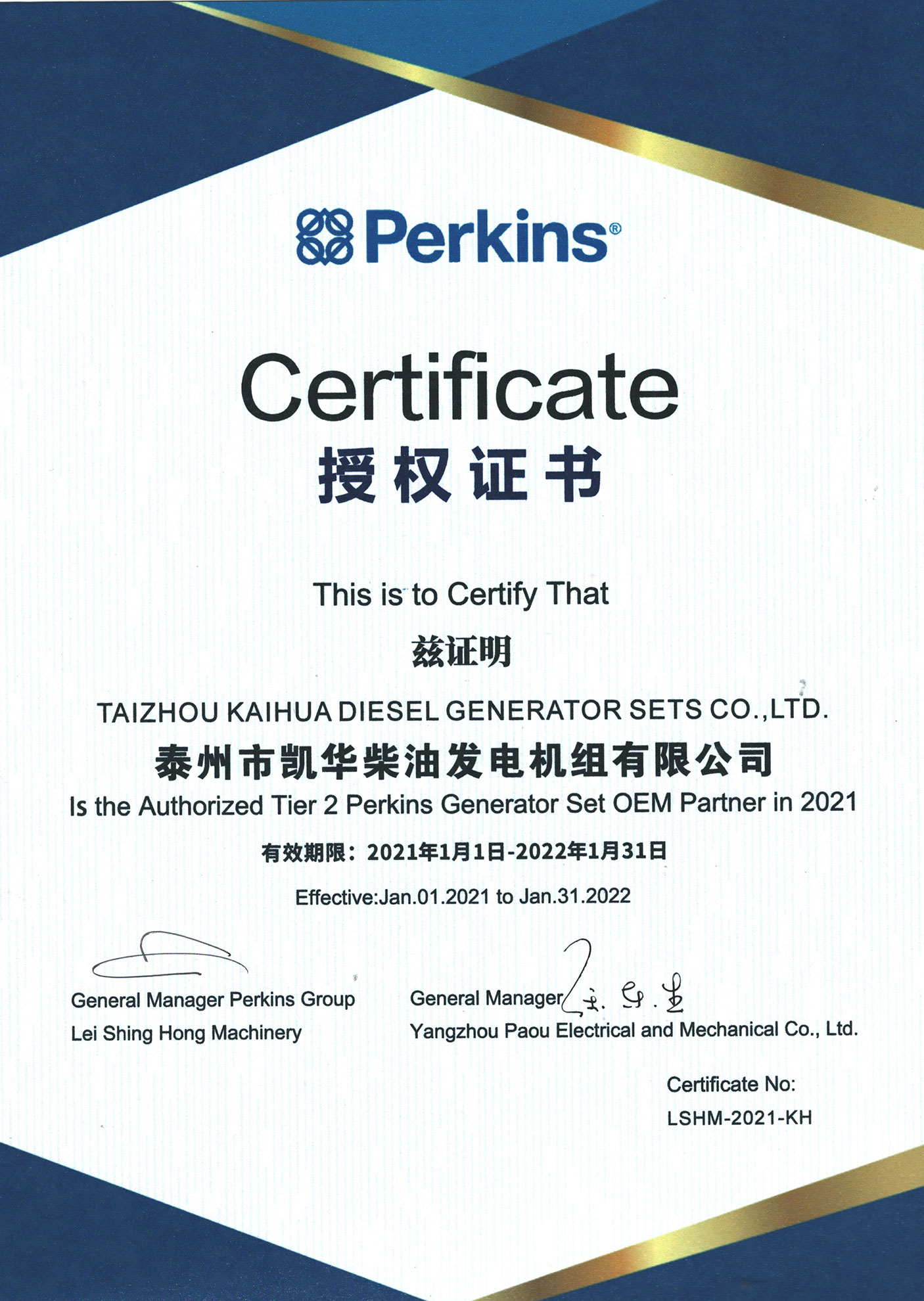 珀金斯OEM證書