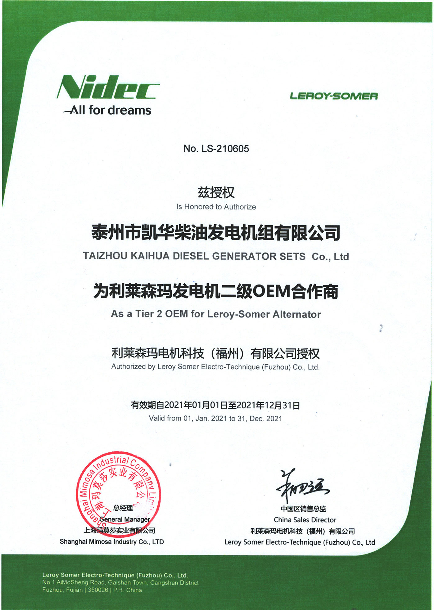 利萊森瑪OEM證書