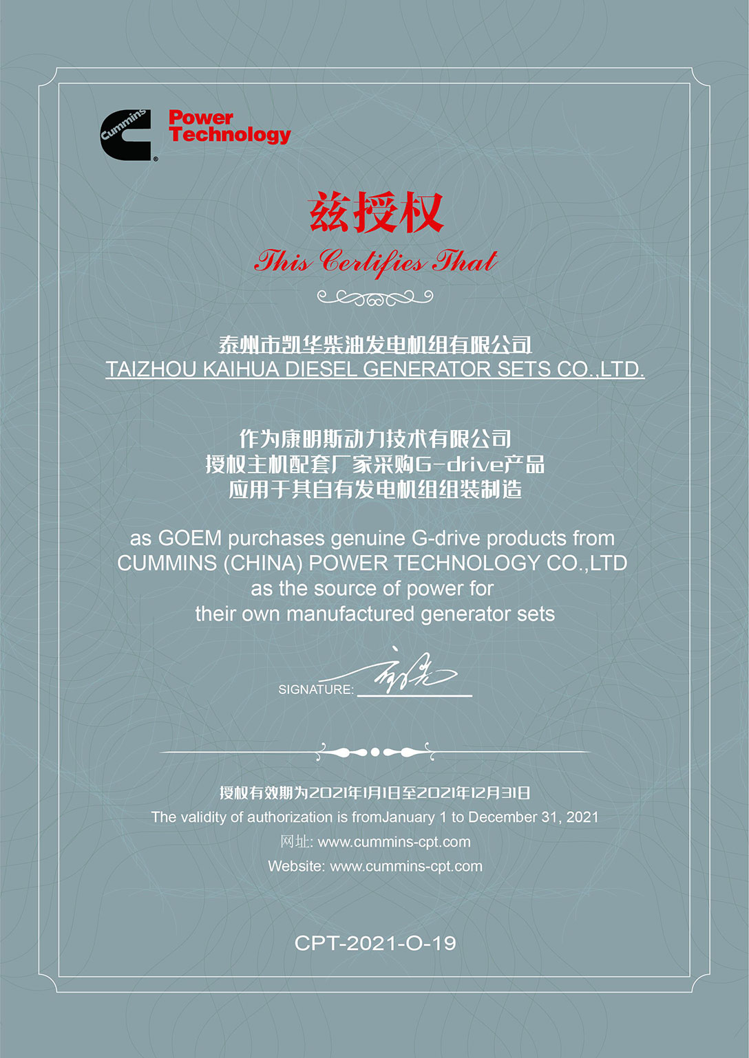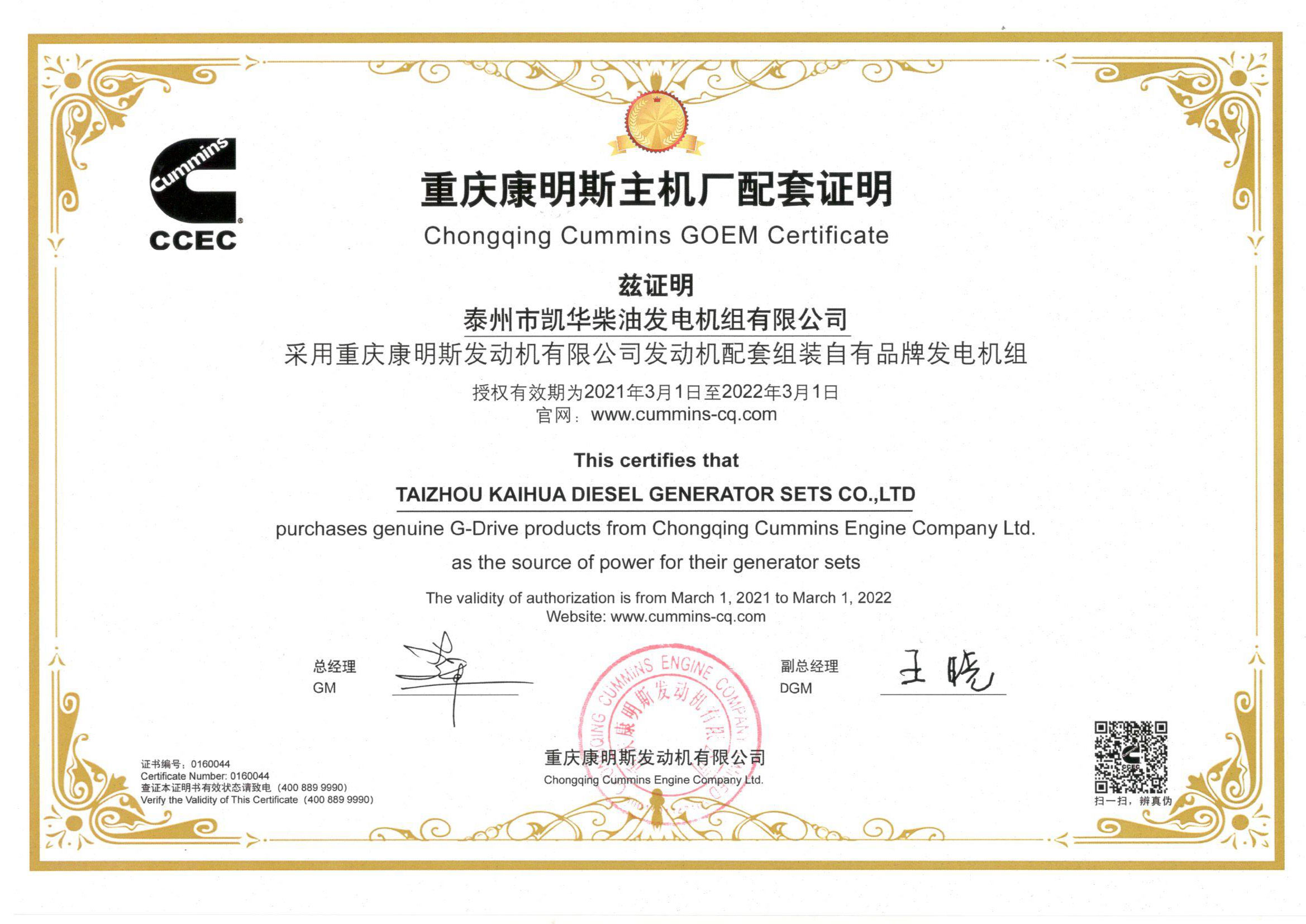 重慶康明斯OEM證書